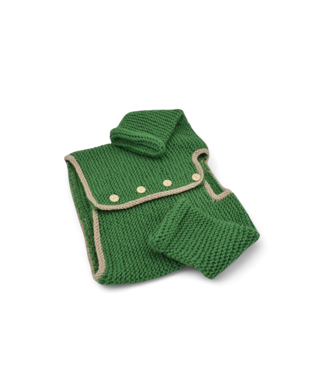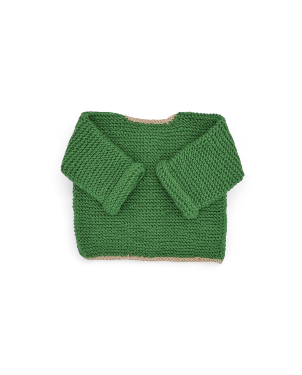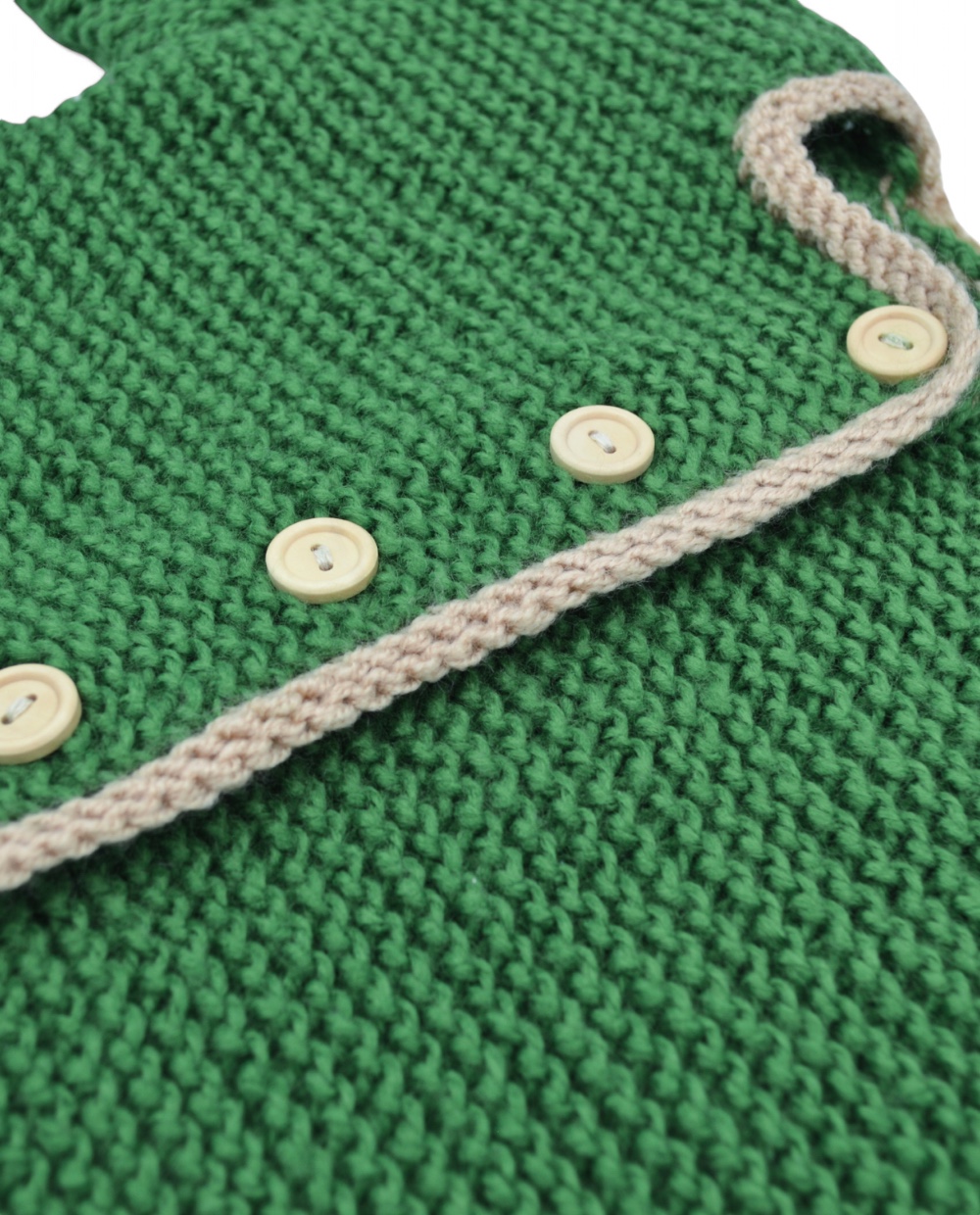 Acest cardigan verde, cu detalii bej pe margini, este confecționat din fire românești Canguro, oferind stil și confort într-un singur pachet.