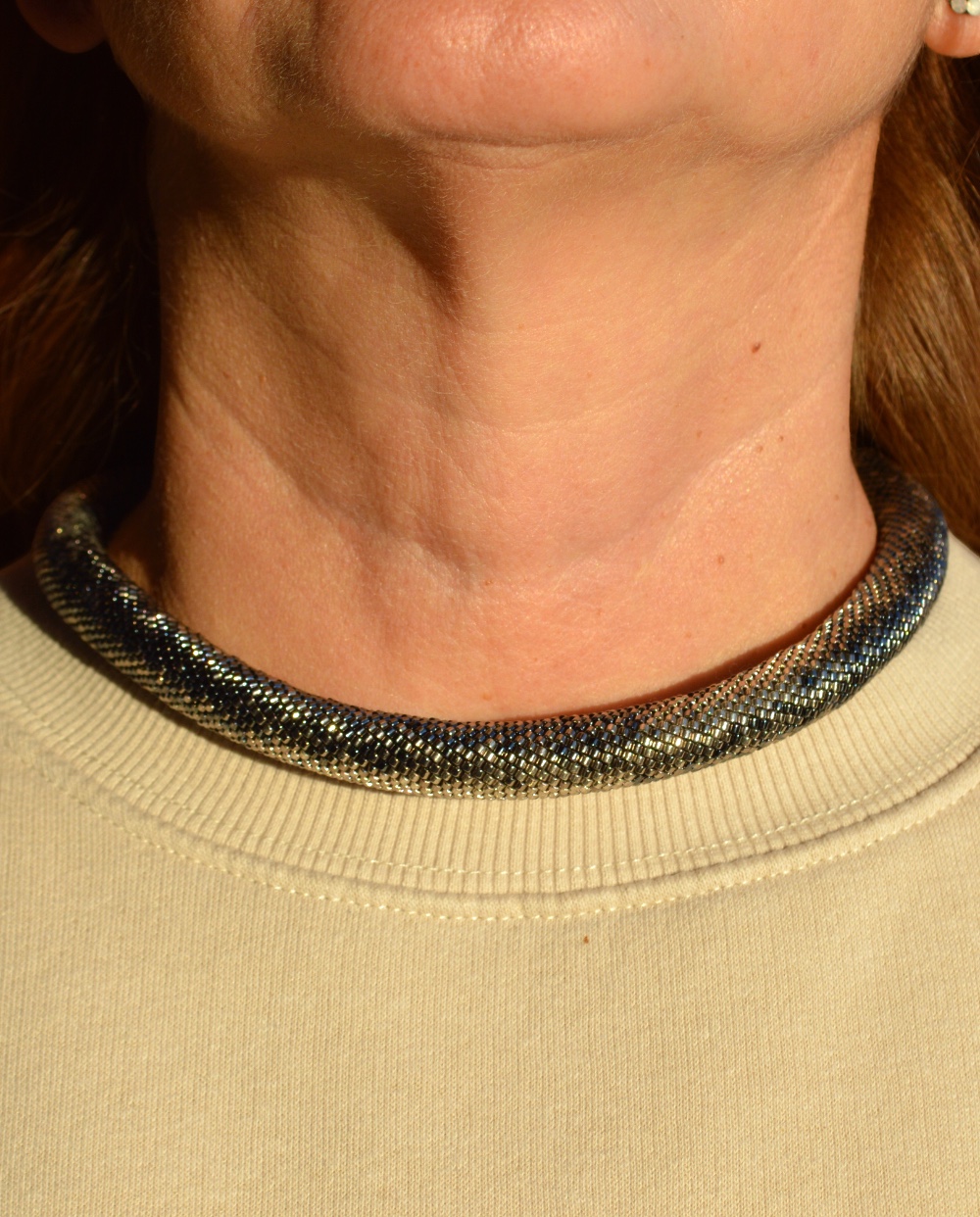 Un simbol al luxului, acest colier argintiu croșetat manual din mărgele Miyuki Delica este ideal pentru femeia modernă, care își dorește să combine eleganța cu stilul contemporan. Strălucirea subtilă a argintiului și designul meticulos fac din acest colier o piesă de rezistență, care va atrage toate privirile, indiferent de ocazie.