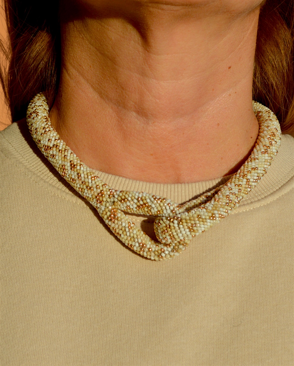 Acest colier croșetat manual este definiția rafinamentului. Perfect pentru femeile care iubesc bijuteriile sofisticate, dar cu un design minimalist, acest colier poate fi piesa centrală care să îți pună în valoare frumusețea naturală.
